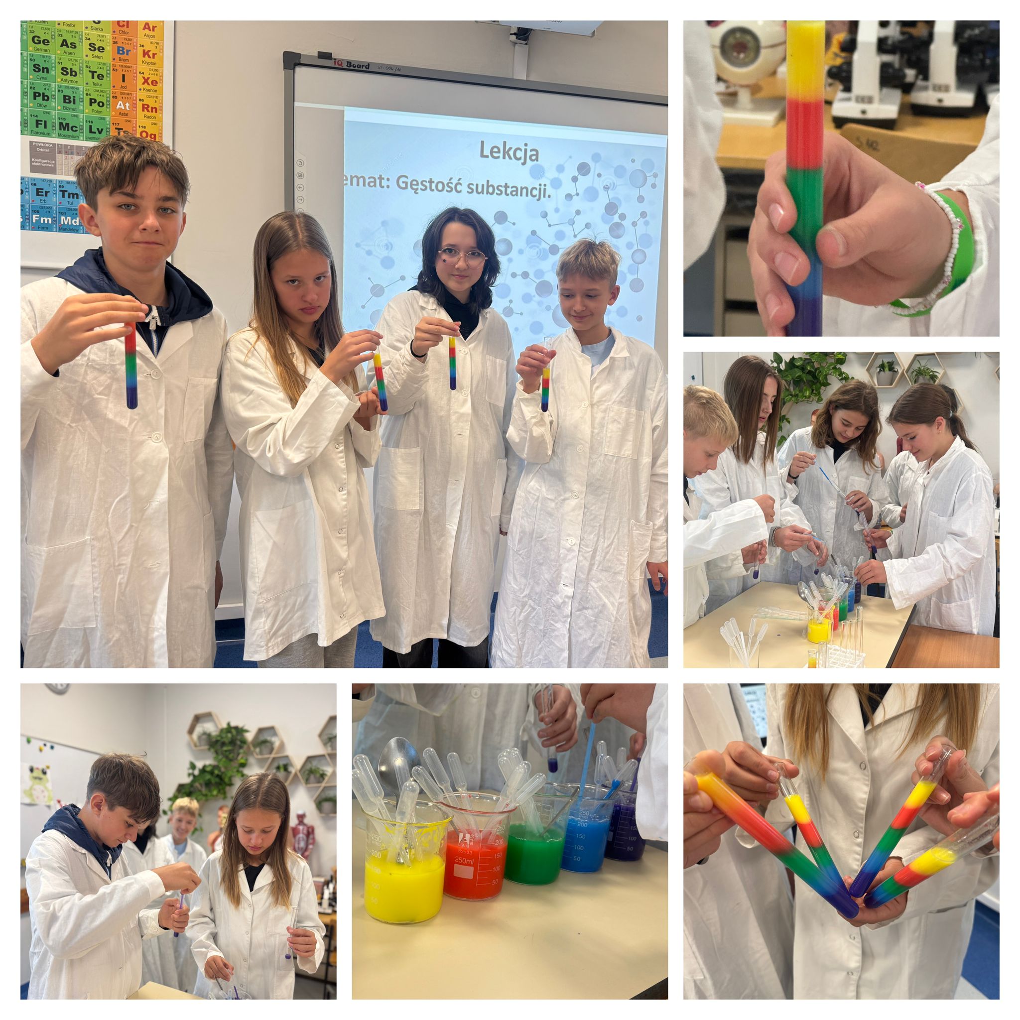 Klasy VII od tego roku uczą się chemii – a na lekcjach nie brakuje doświadczeń. Tym razem sprawdzali gęstość substancji, tworząc kolorową tęczę w probówce . Nauka naprawdę może być efektowna!