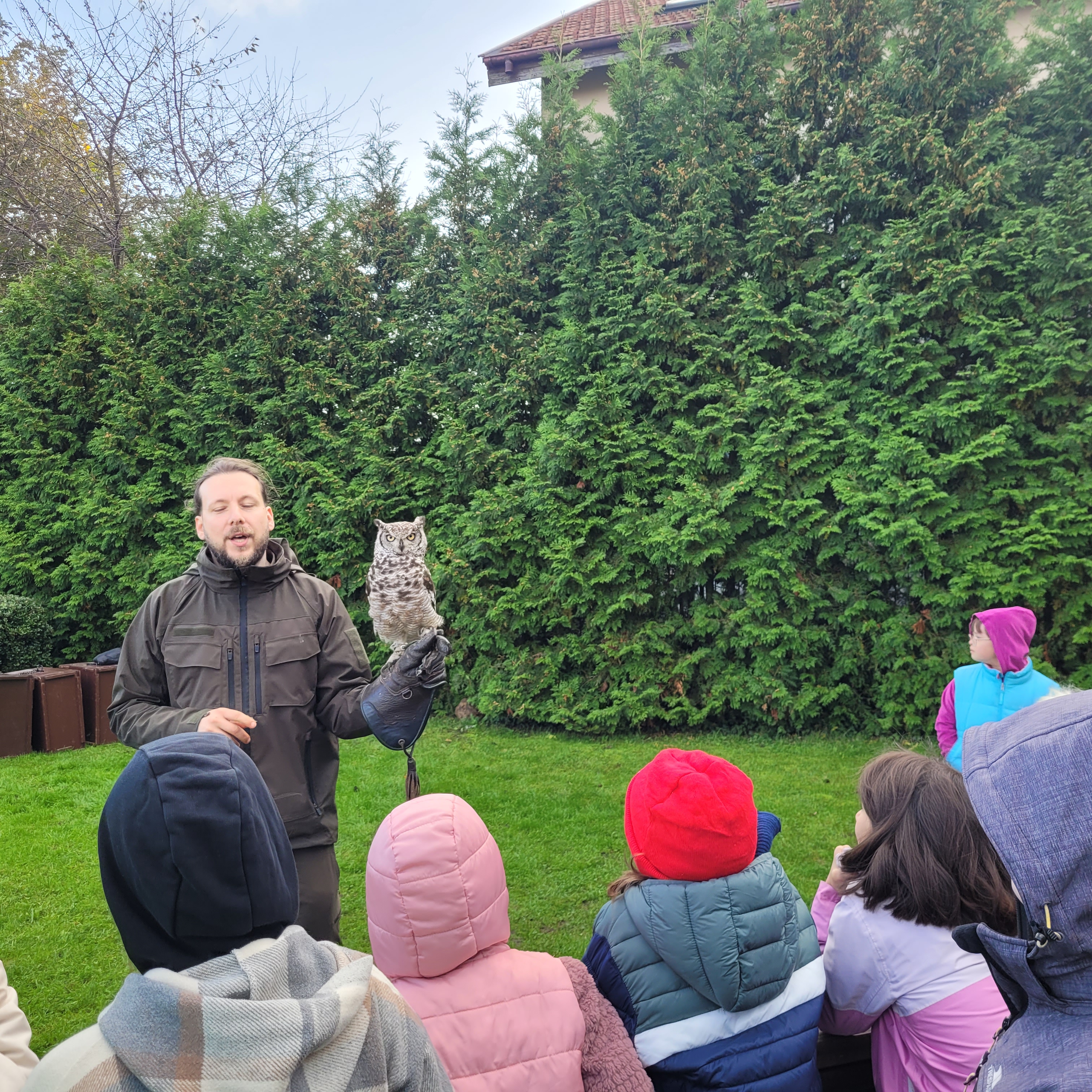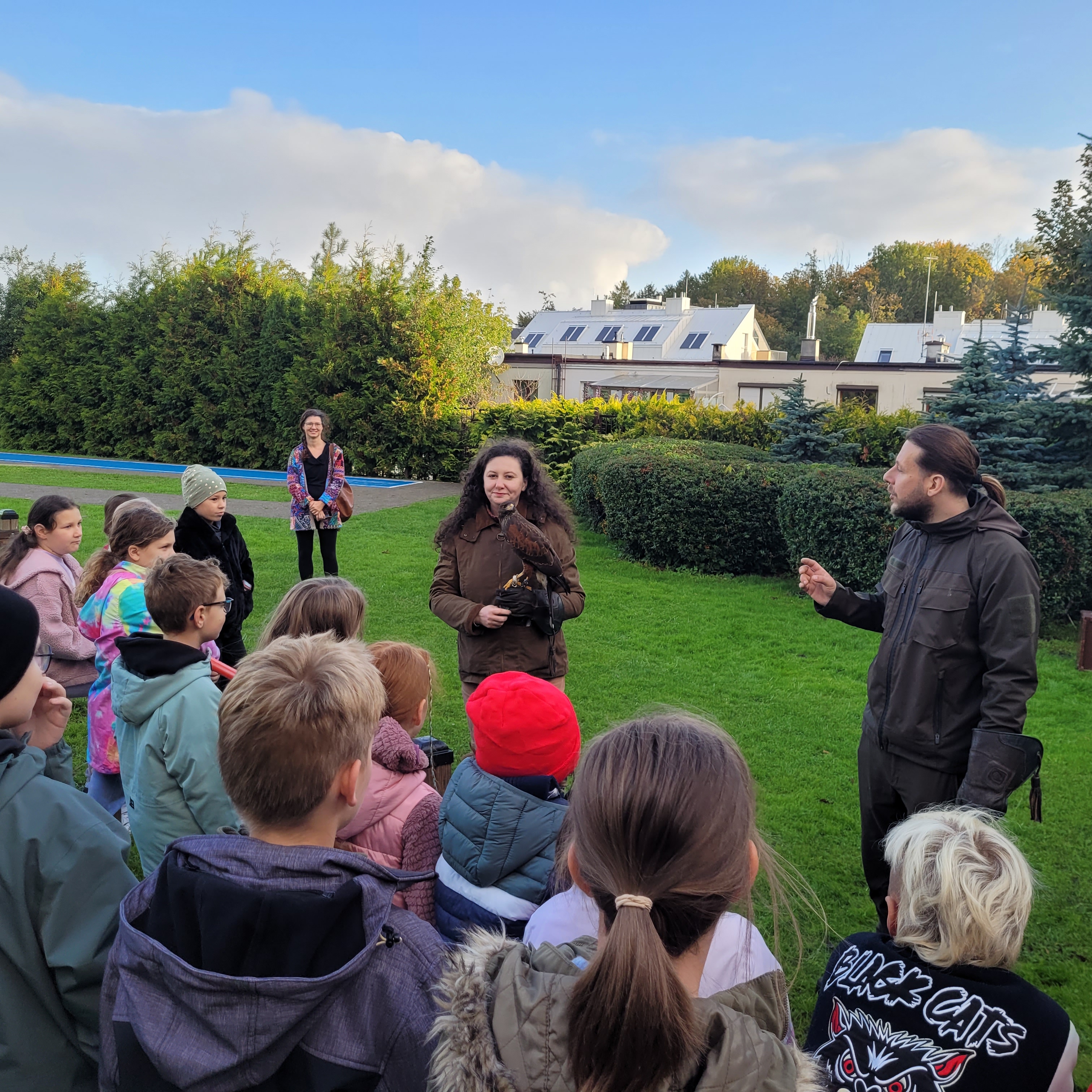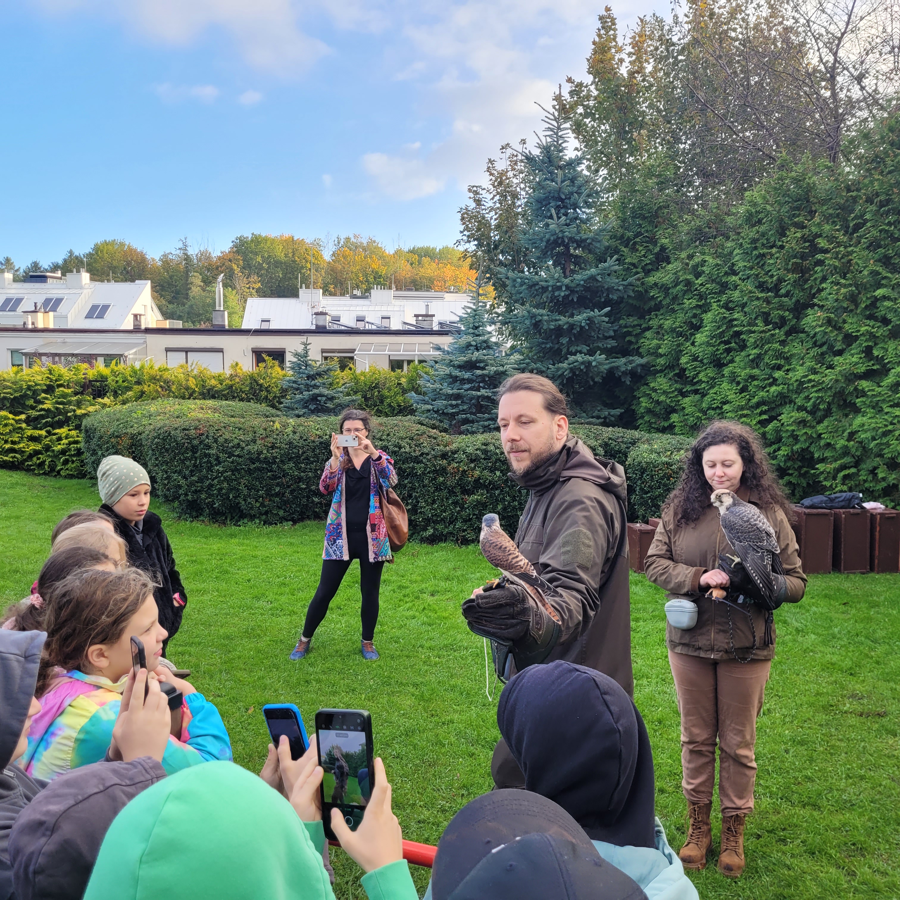 Na terenie rekreacyjnym szkoły dzieci zobaczyły z bliska żywe ptaki drapieżne, które nie tylko prezentowały swoje skrzydła, ale też latały tuż nad głowami! Były fascynujące opowieści, ciekawostki, pokaz pazurów i zwyczajów tych niezwykłych zwierząt. Uczniowie słuchali z zapartym tchem!